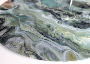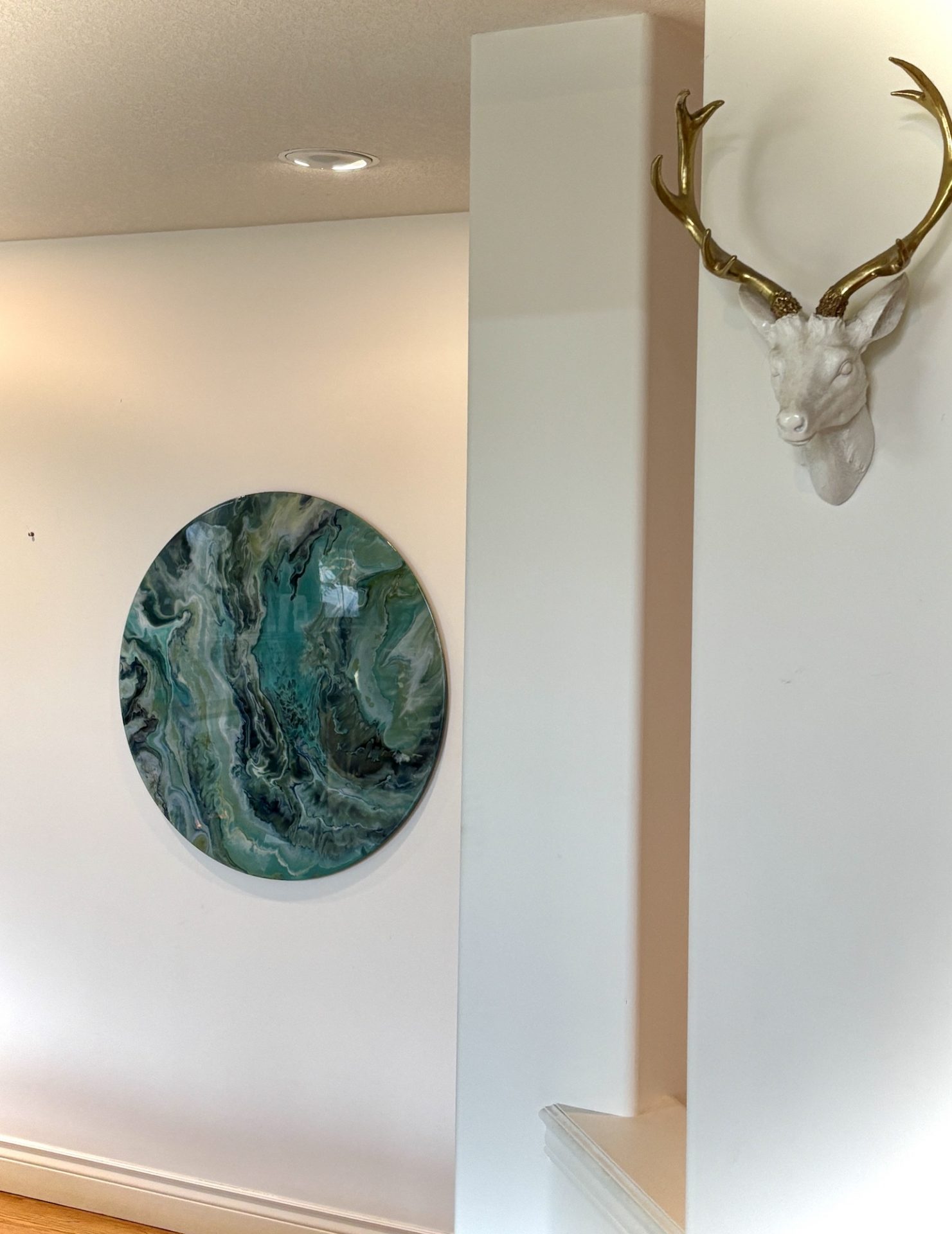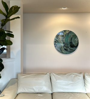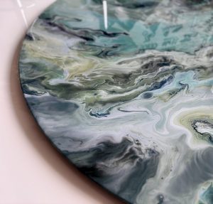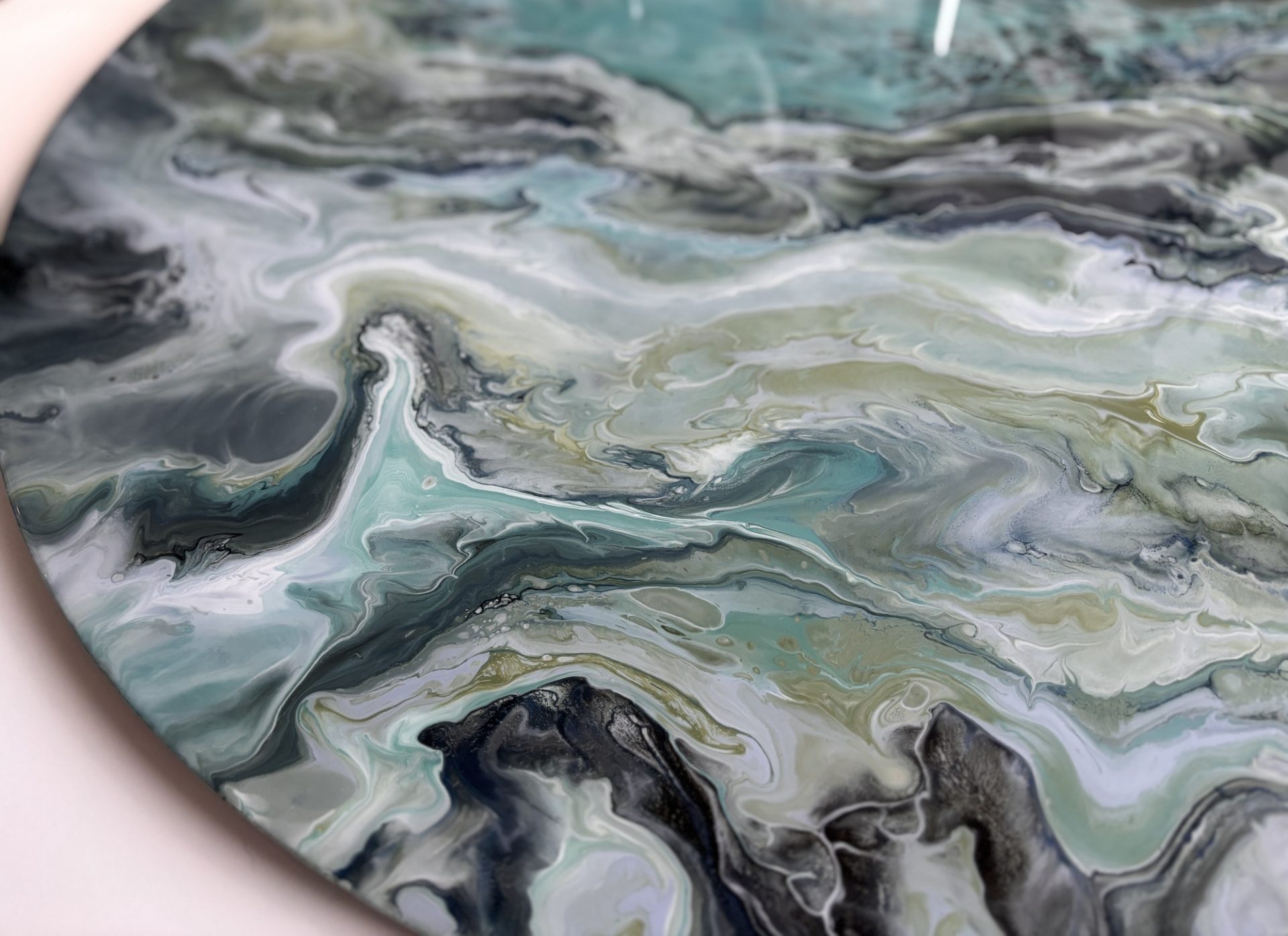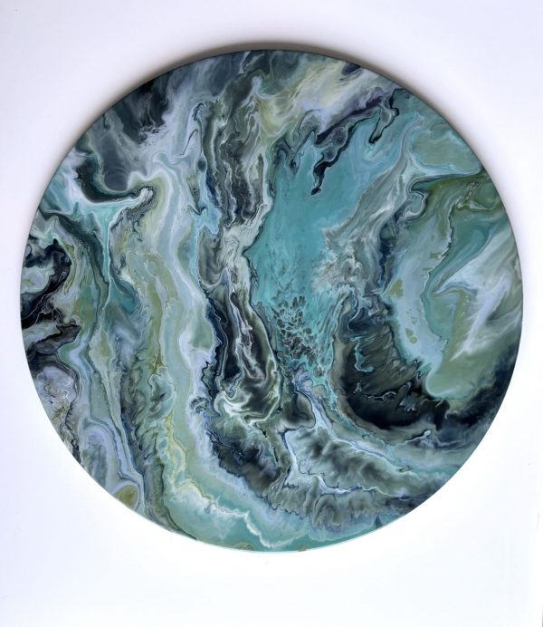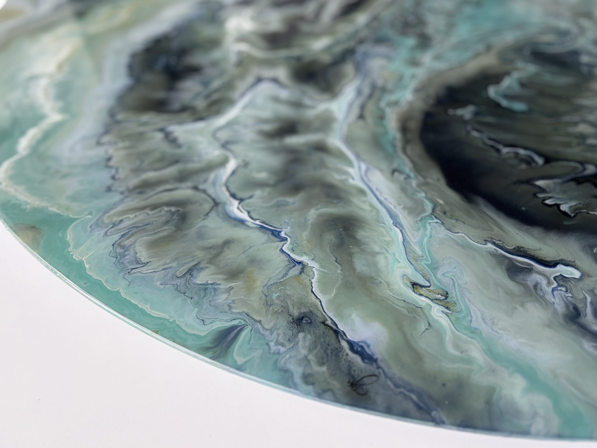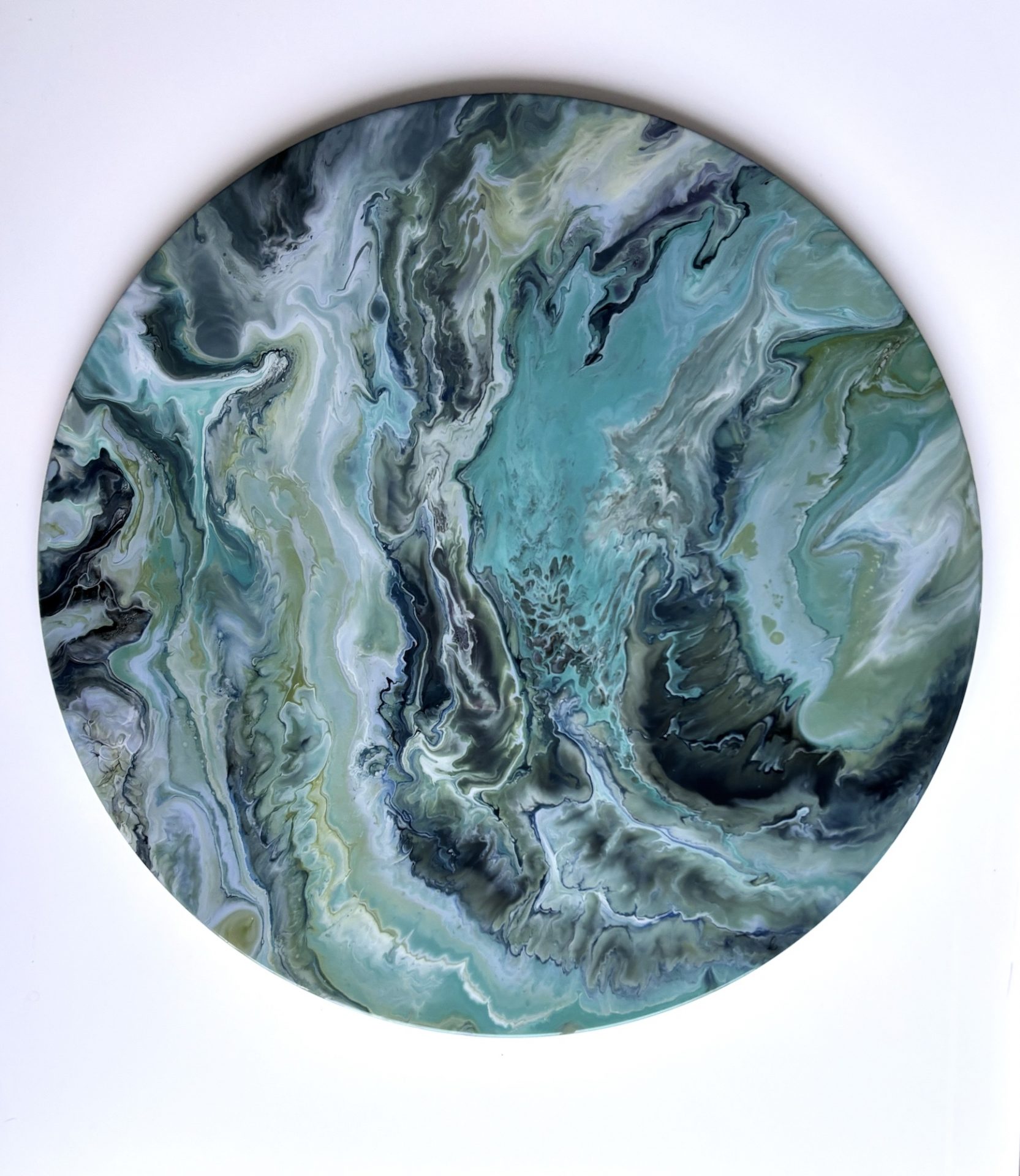 Fluorite Seas is an abstract ocean piece, with hand painted details throughout. Sea greens and blues are the dominant tones, with charcoal and cream throughout.